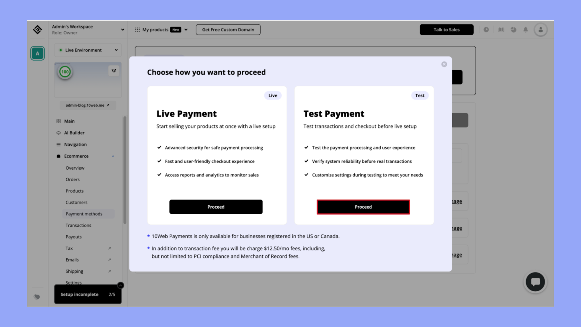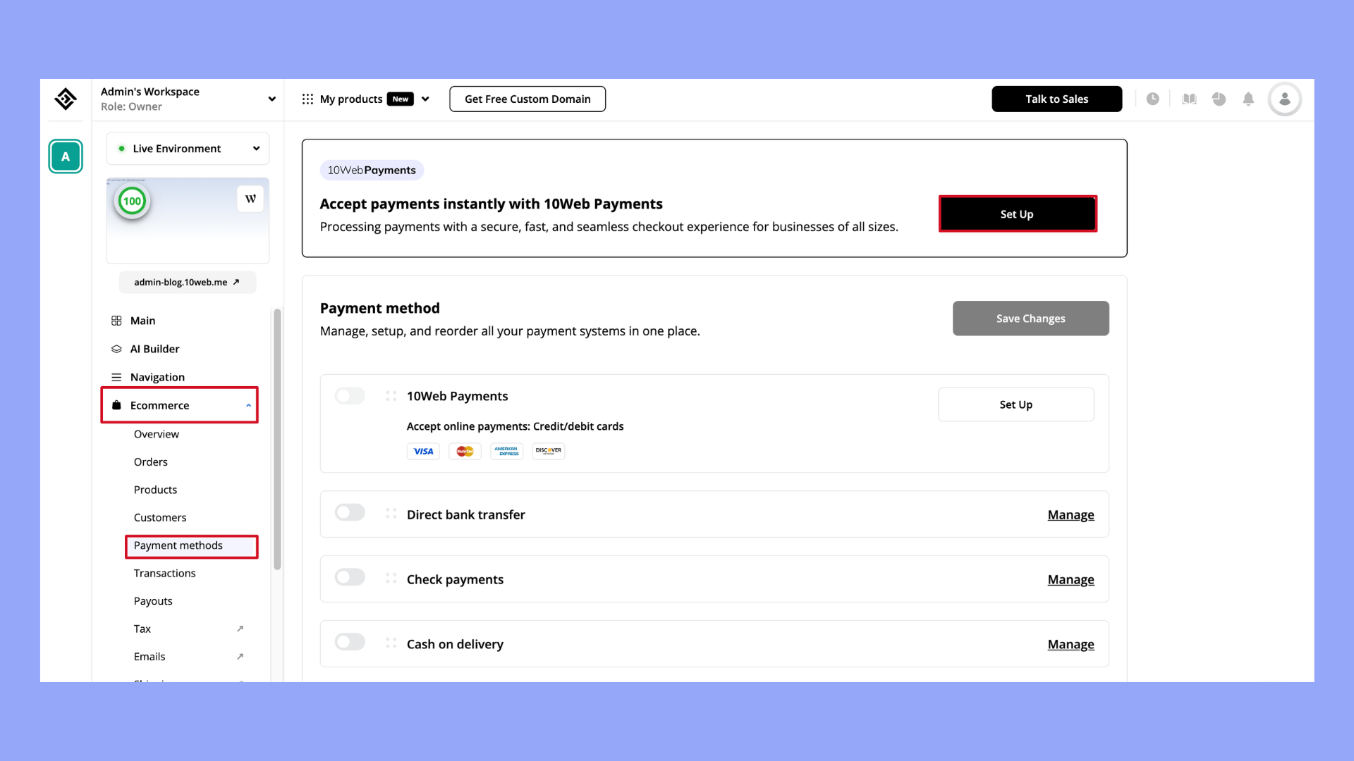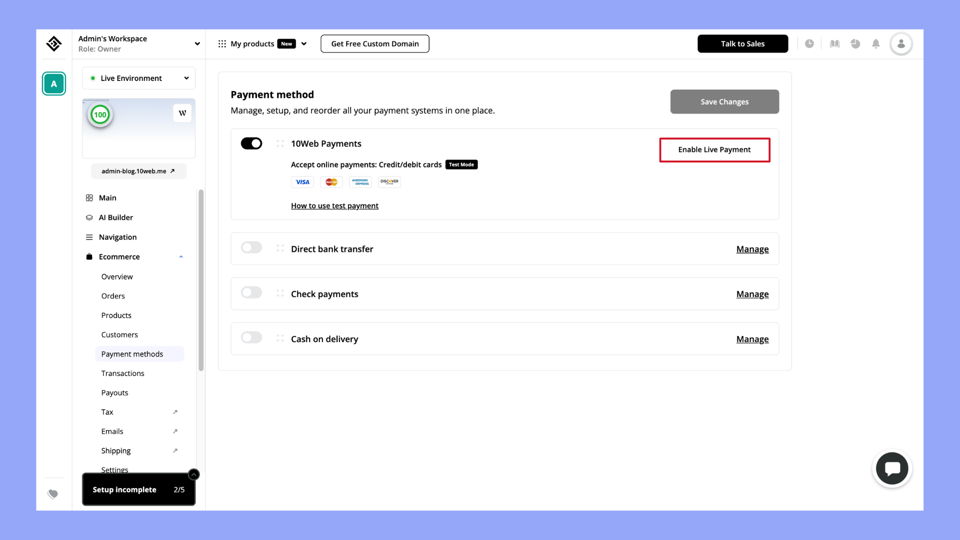 Cuando utilizas el plan 10Web Ecommerce, también tienes acceso a 10Web Pago. Aquí tienes los pasos para activarlo: