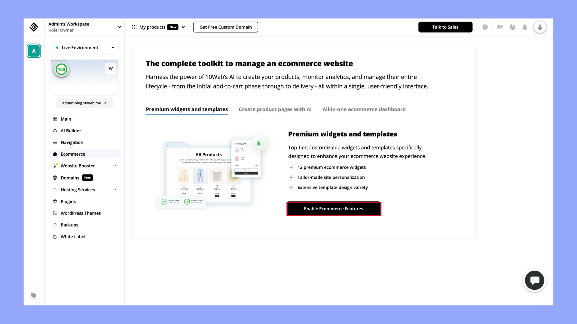 Al utilizar 10Web para crear tu sitio web de comercio electrónico, podrás configurar tu tienda online desde una única plataforma, lo que hace que navegar entre secciones sea más fácil y lleve menos tiempo.
