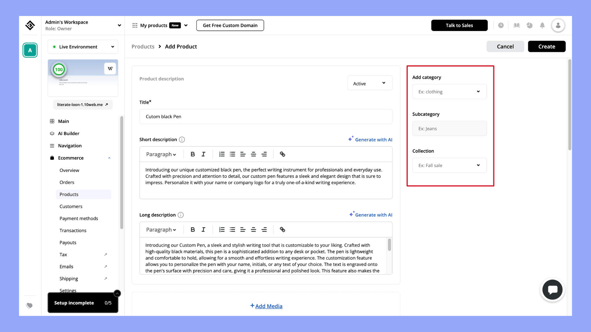 - Categoriza tus productos haciendo clic en el botón Añadir categoría. También puedes añadir una Subcategoría y Colección para el producto.