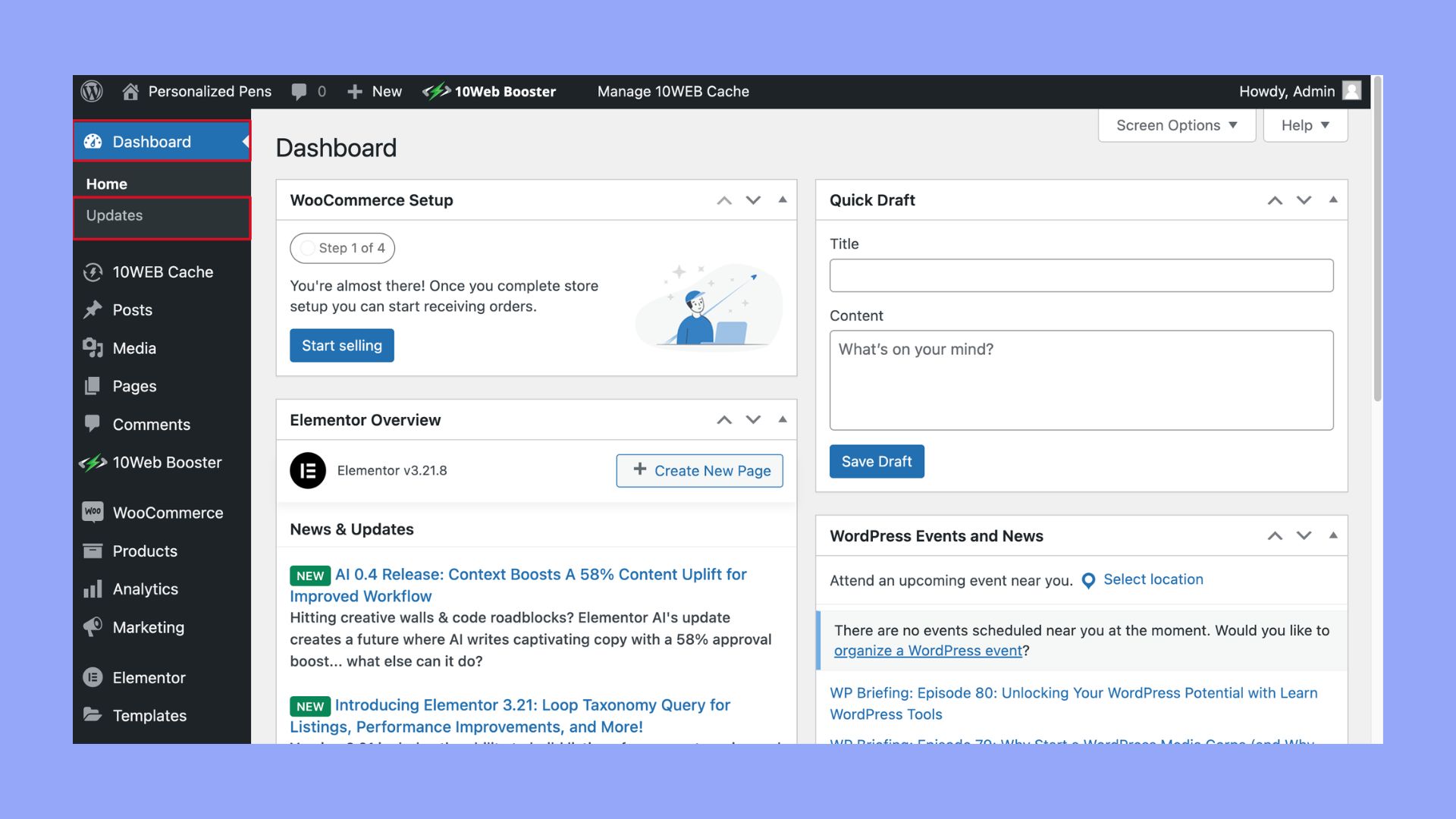 - Comprueba si hay actualizaciones: Antes de ponerte en contacto con nosotros, asegúrate de que tu núcleo de WordPress, el plugin WooCommerce y cualquier tema o plugin adicional están actualizados. Ve a tu Panel de control > Actualizaciones para ver si hay actualizaciones pendientes.