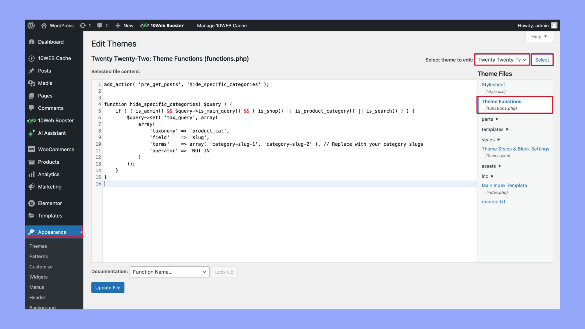 Para ocultar las categorías mediante código personalizado, considera la posibilidad de añadir funciones al archivo functions.php de tu tema.