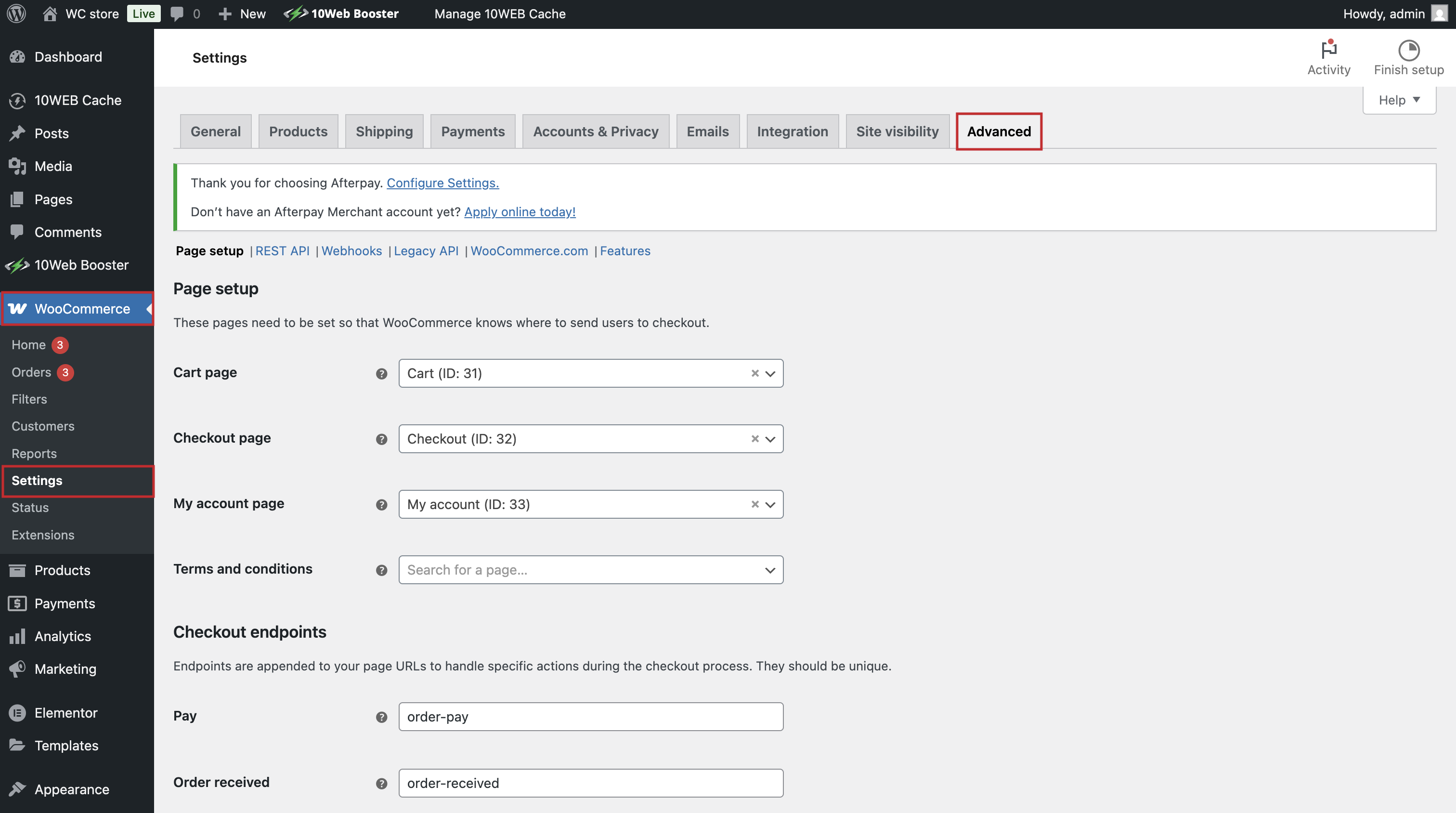 - Go to WooCommerce > Settings > Advanced.