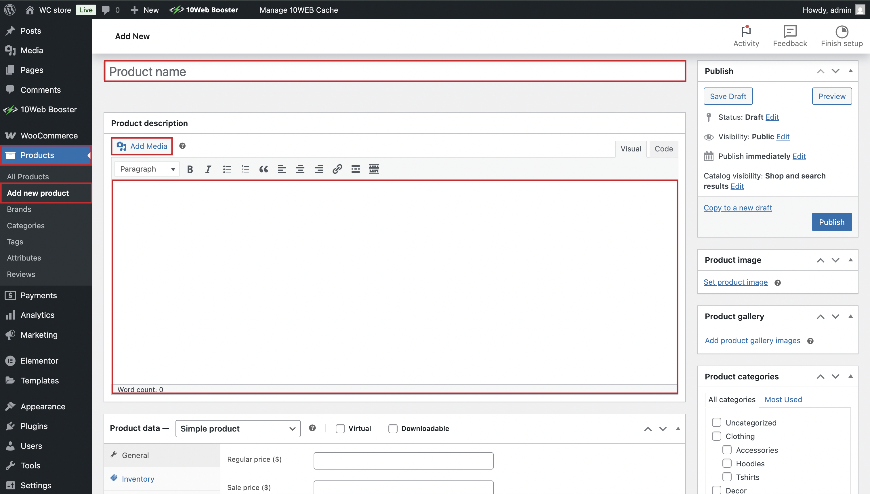 Go to Products > Add New in your dashboard to add your products. You can enter details like product name, description, price, images.