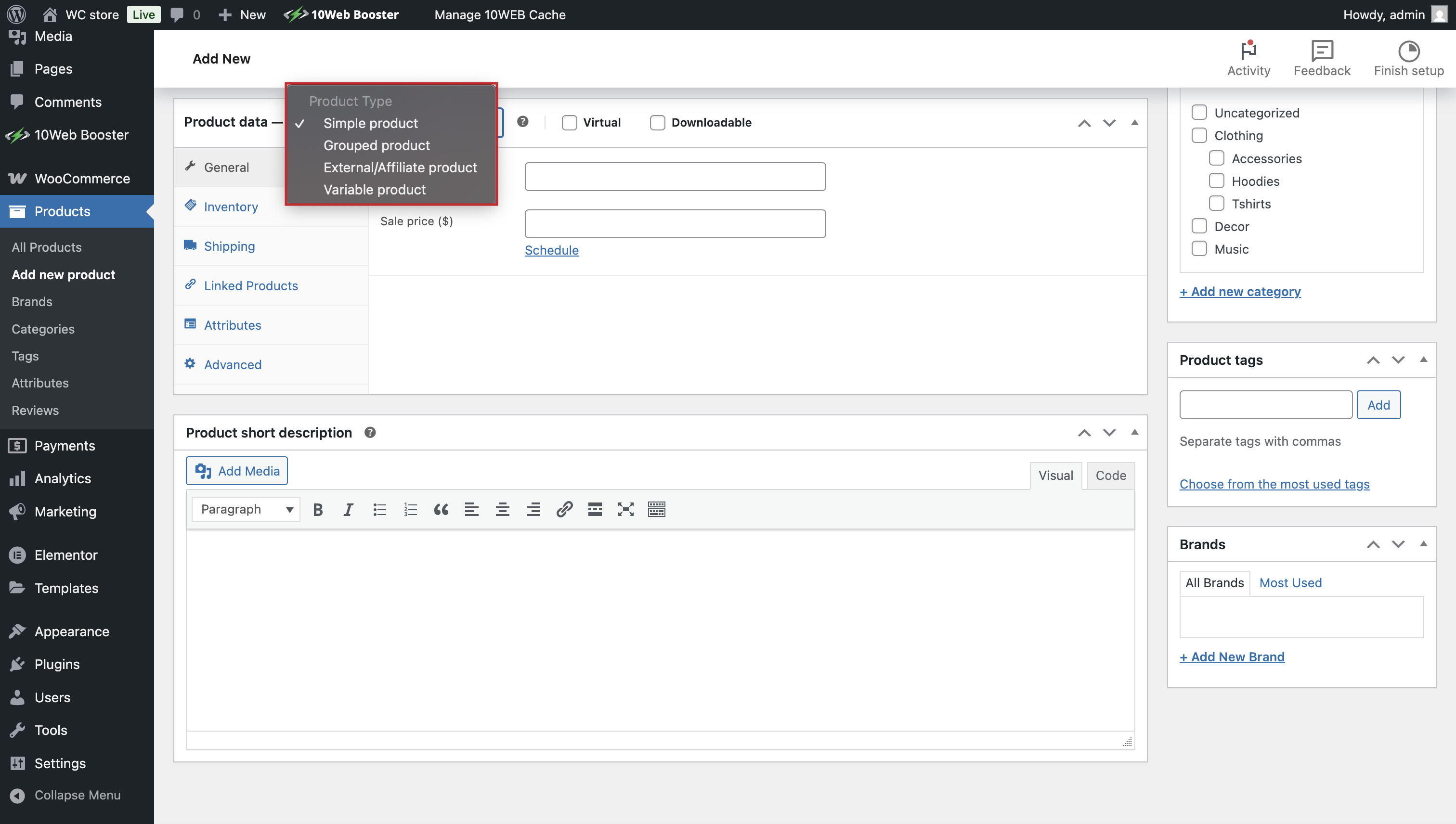 Under the main text editor, you will find the Product Data panel. Here you can adjust your Product Type from a dropdown menu.