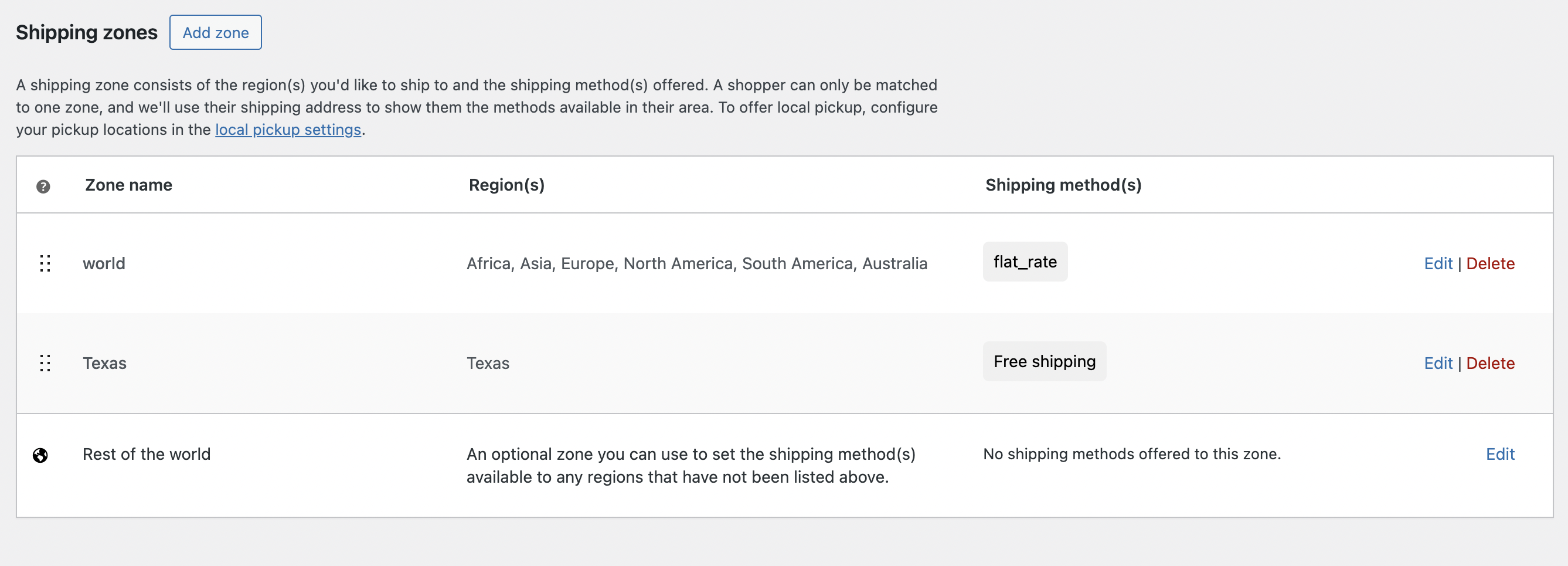 - Add shipping zones for different regions (local, national, international) by clicking Add Zone.