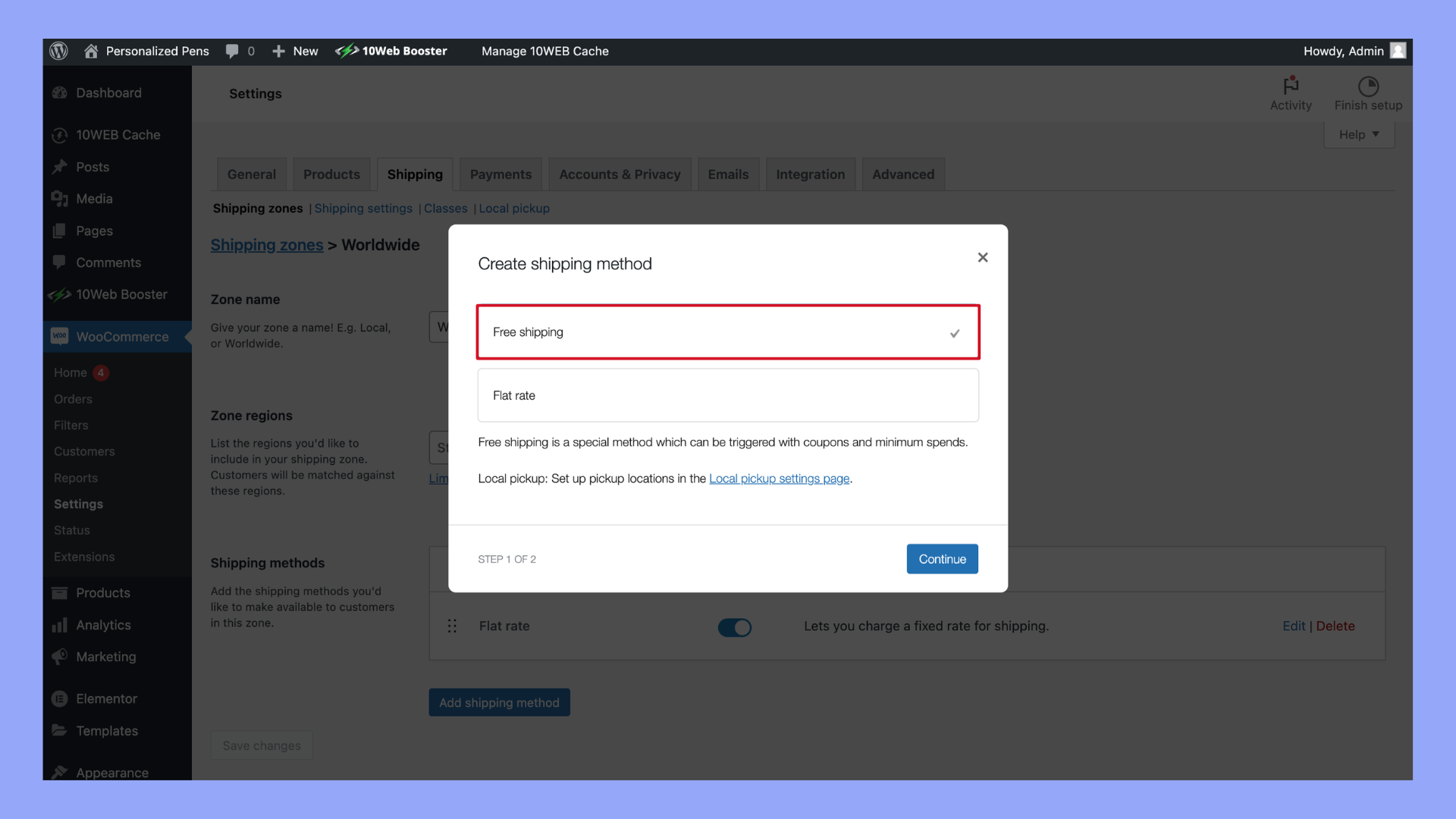4. In the dropdown, choose Free shipping. Then, confirm by clicking on Add shipping method.
