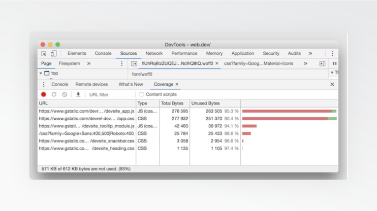 - Press to Reload to start capturing coverage. The used and unused bytes filtered by URL, JS, and CSS will be visible.